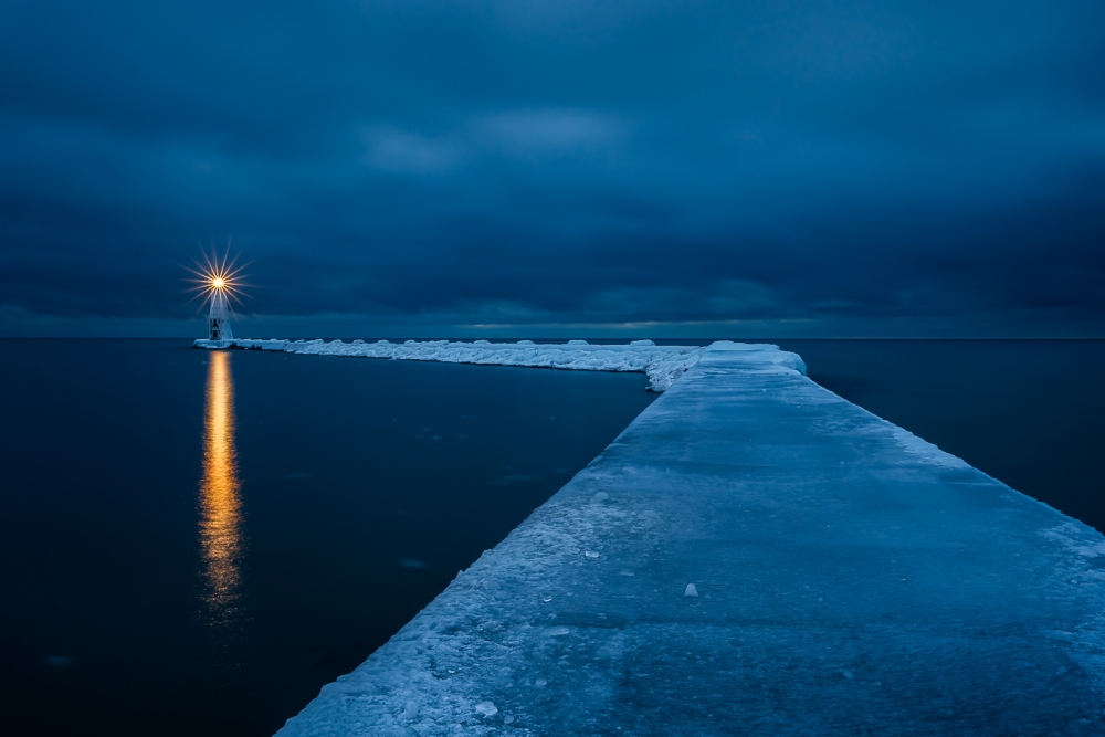 One of my favorite photos is “Frozen Passage”. It was taken in a sleepy little town called Frankfort on Lake Michigan shore in the winter. When I arrived in a heavy snow storm, the entire resort had less than five guests. I am sure I was the only photographer in town. I scouted the area and waited for the gloomy sky to clear. Near the dusk of second day, I saw a glimpse of hope. There was a slim gap in the thick cloud at horizon towards west. I put on the ice cleats and headed out to the icy pier.