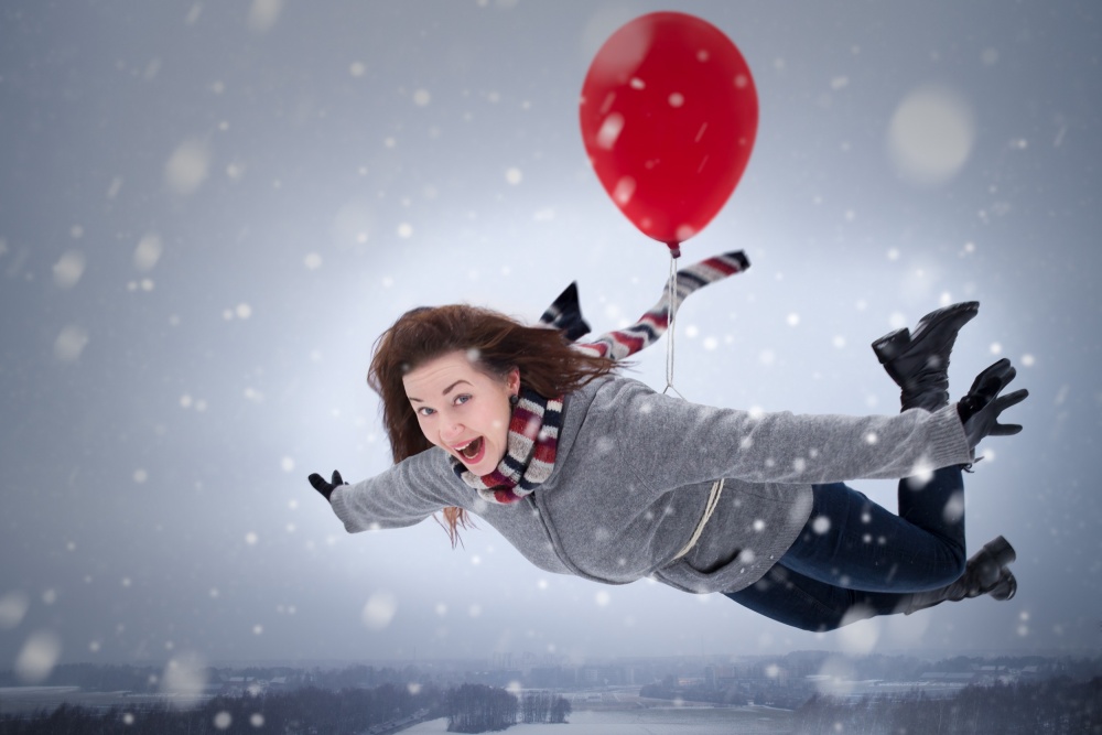 She is quite excited, happy and so proud of herself, this flying lady flying above a foggy landscape. Her face tells it all while she is slowly floating by. It is a form of levitation - originally a mystic phenomenon and now rather popular among photographers. There are lots of tutorials to be found on the web, as a side note.