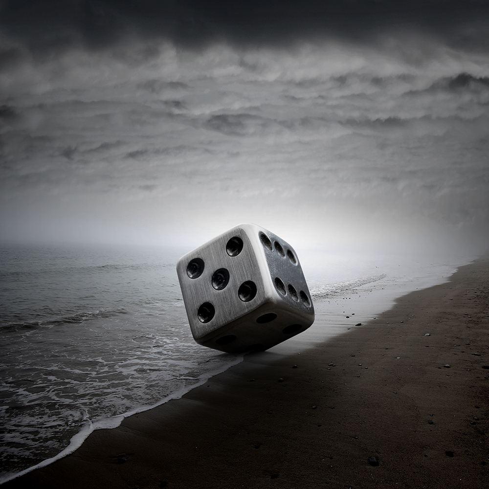 The dice is as symbolic as is the sea. Both are unpredictable. The sea seems to be very calm. The waves are rolling gently onto the beach. But in the background, above the fog, restless cloud are already looming - the messengers of a storm and waves that soon might hit the beach. But will they? You'll never know.