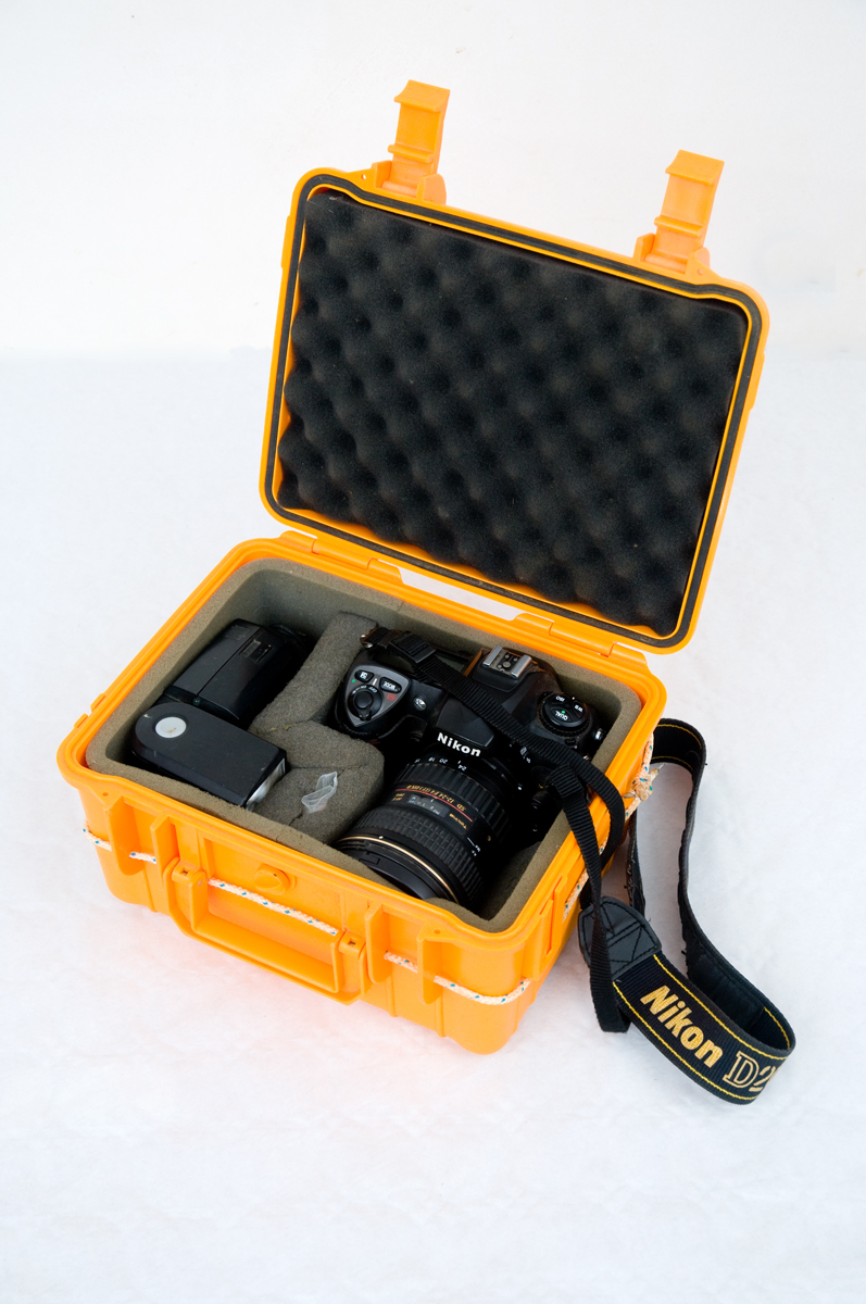 Waterproof and shock-proof case containing a DSLR and flash.