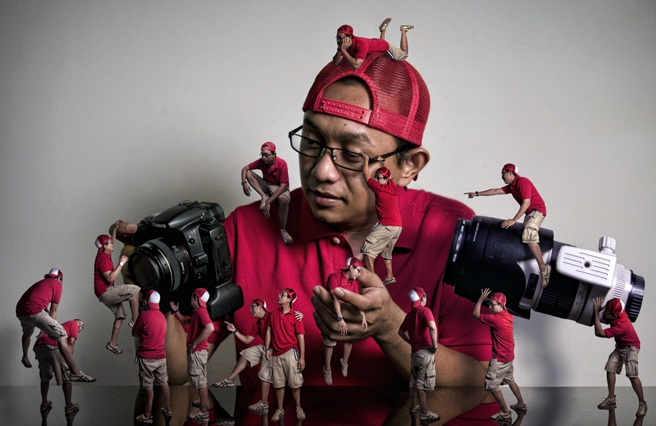 Then I took pictures of various poses according to the sketch. The number of pictures for each pose varied, and I took extra shots to have options when I later constructed the composition. I had to use my imagination regarding the poses of the Mini-Me's in the scene by visualizing the final image. Some shots were a bit tricky because I had to synchronize my pose with the self-timer as I jumped or moved.