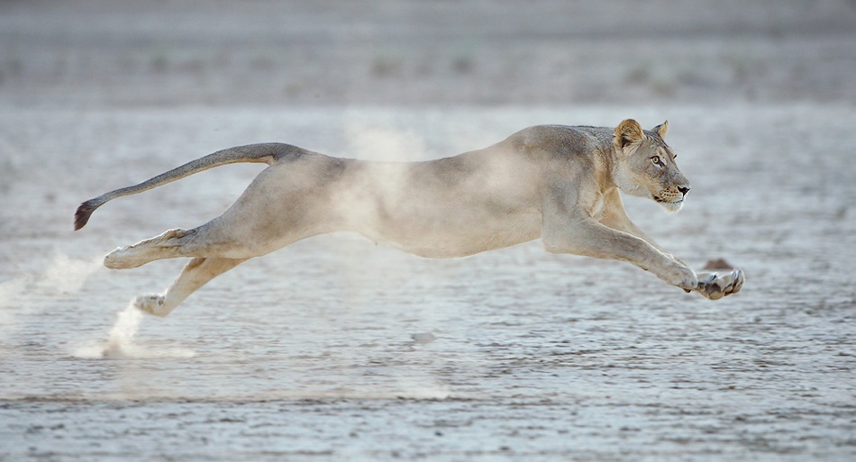 "When the lioness eventually took off after her intended prey, I kept the central autofocus point on her face/eye by panning along with her movement."