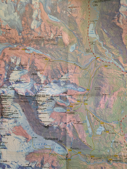 Before embarking on my trip, I purchased a topographic map of the park and spent considerable time carefully studying it. Once arriving in El Chalten, I also obtained a copy of the park’s survey map from the hostel, which provides supplementary yet useful information of the whole park.