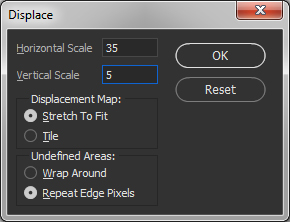 A displacement mapping is a distortion of every single pixel by a mapping of brightness. The Photoshop filter combines the picture with a second one determining how far it becomes shifted, horizontally, vertically, or both. You can determine how much and which dimension in the dialog popping up before rendering: