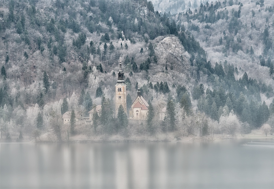This image was taken in January 2013 at 10:00 a.m. on Lake Bled in Slovenia. The picturesque glacier lake is located among the forested foothills of the Julian Alps. The lake is in the northwestern part of Slovenia, and is a real jewel of the Alpine region.