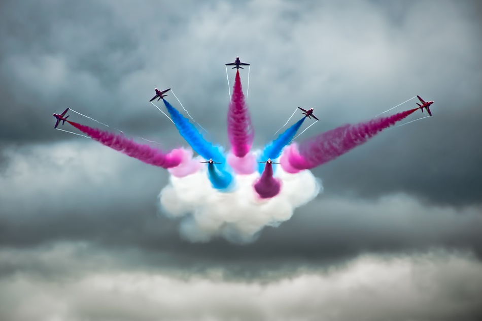 To overcome the lack of light, I had to move to a more expensive solution and used the large Nikon 600mm f4 lens with the 1.4x teleconverter to give 840mm focal length at f8 and (on this occasion) ISO640. A one and a half stop improvement may not sound much but it made all the difference in keeping the shutter speed up at a low enough ISO. Practice with panning and single-shot autofocus setting complete the technique together with several attempts at each pass. The chance of getting both a damp day and blue skies was increased by attending the show on multiple days.
