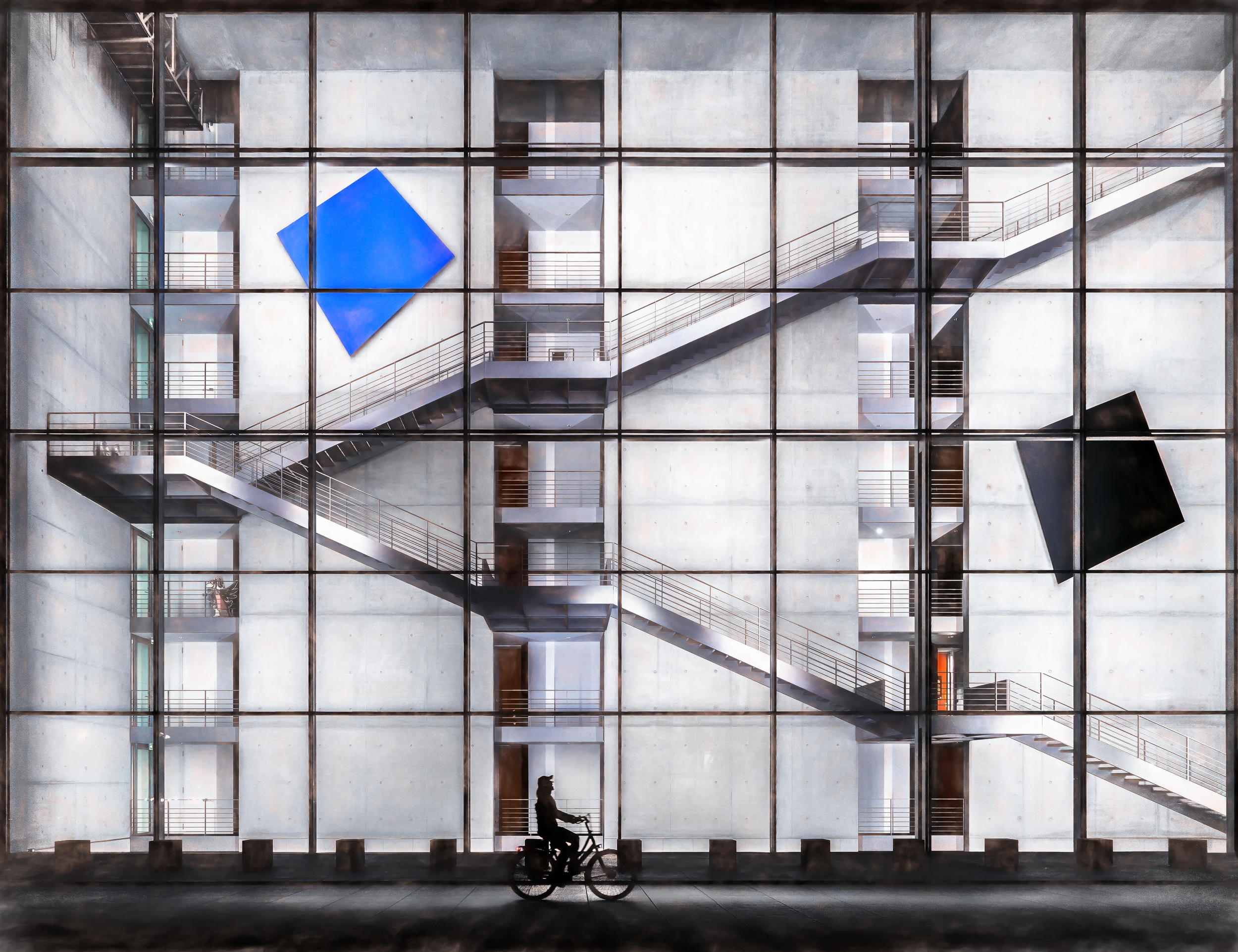 My photo shows a visitor on the staircase who is fascinated by this art work. I was fascinated by this situation, too. At the same time, I was impressed by the graphic effect of the architecture and the presence of numerous geometric shapes. To enhance this effect, I split the photo diagonally and turned one half into a negative, thus resulting in more geometric shapes and a surreal overall impression.