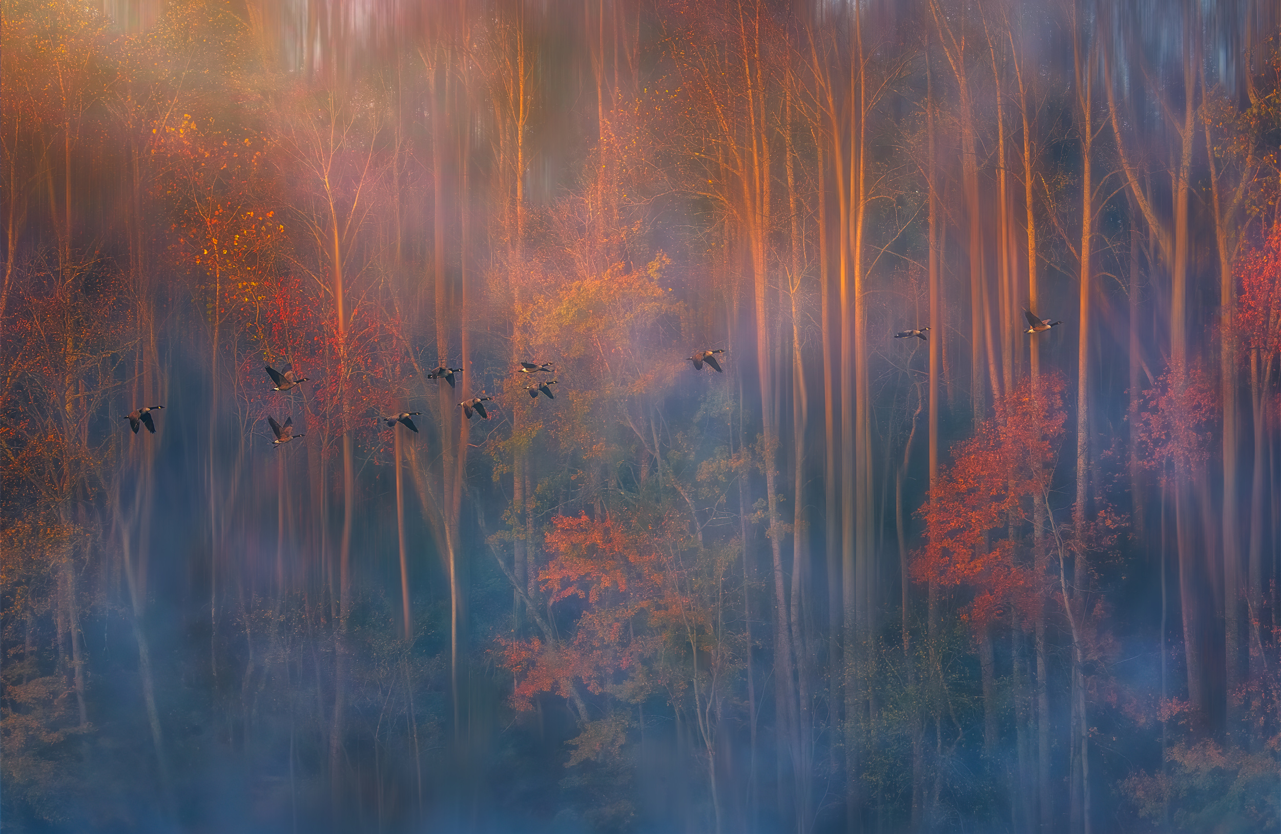 This is not a perfect photo but is my favourite one that taken two years ago at a local park near my home. It was a misty morning and I planned to practice my wildlife photography skill by taking the departure moment of Canadian geese on the lake. While I was waiting and focusing on the water surface, suddenly a flock of flying geese under the morning light caught my eyes. I very quickly changed the focus, and aimed to them in front of these beautiful autumn wood. During post processing, I enhanced the light and colour, adding my artistic treatment to it.