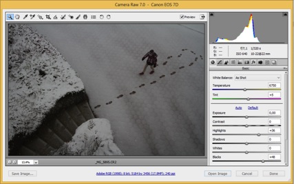 The image was processed in Adobe Camera Raw 7.0, Photoshop and Nik Software's Silver Efex Pro 2 plugin.1) In Camera Raw, the histogram showed that the image was a bit underexposed, so I moved the Blacks slider to +48 and the Highlights slider to +36. I then exported the image to Photoshop.