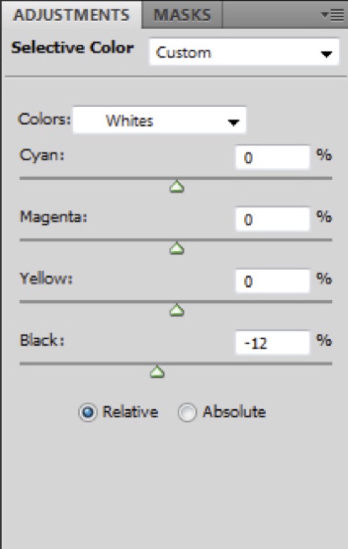 8) Next, Topaz Detail 3 plugin was used to sharpen the image.9) Back in Photoshop, I needed to correct the neutral values and give more clarity to the image. So I applied a Selective Color adjustment layer and removed Black (–12) from the Whites.